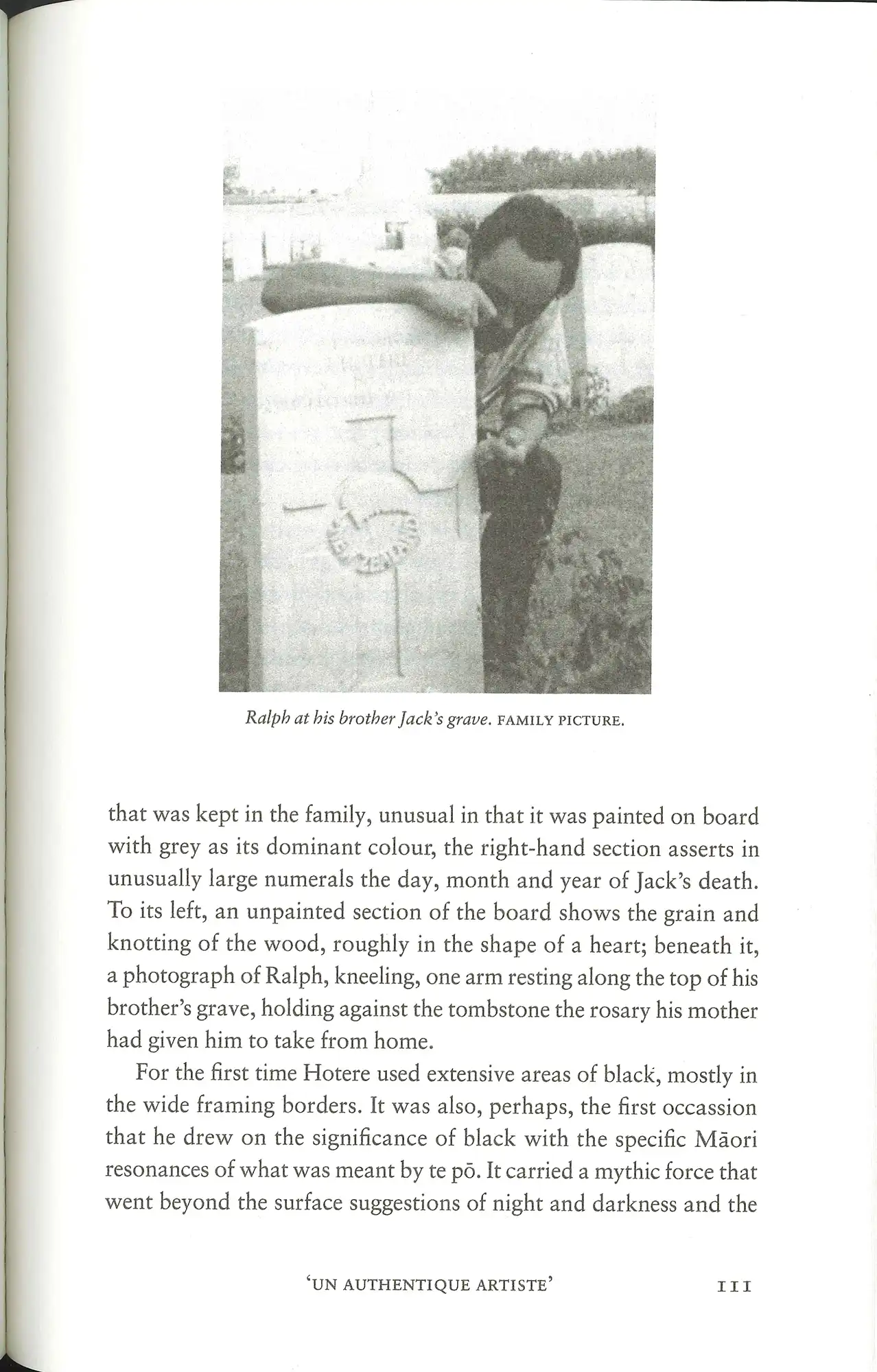 When Hotere was nine, Jack, his older brother, enlisted and eventually joined the 28th Māori Battalion. On 23 December 1943, two days before Christmas, Jack, aged 22, was killed during an engagement at Sangro River, near Orotona, on the Adriatic coast, Italy. Hotere’s brother’s death was a deeply personal event. In 1963, he travelled to the Sangro River cemetery and visited his brother’s grave site. ‘Sangro’ was the result, in effect, one of his first anti-war paintings. Sometime after 1955, he obtained this copy of the War Graves Commission publication that lists his brother amongst the names of the others fallen in battle. On display is a map of the Sangro River area and a detail of the entry on his brother. On the title page, Hotere has written ‘Jack Hotere’ and the name of ‘Whito Arona’, the name of another Hokianga lad killed in battle.