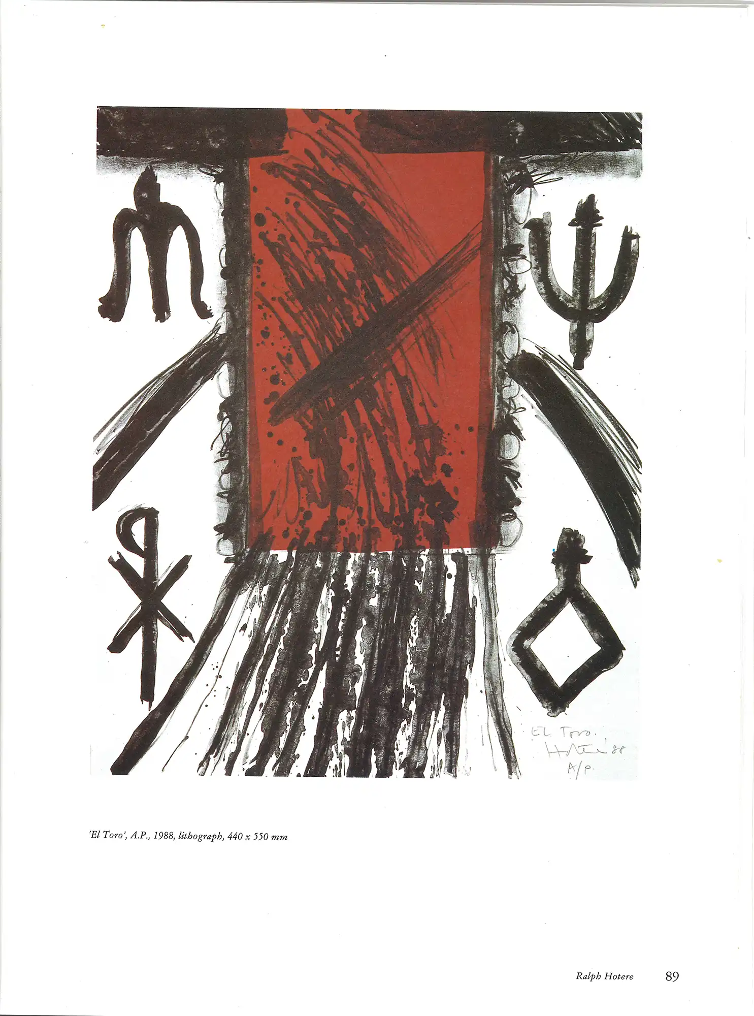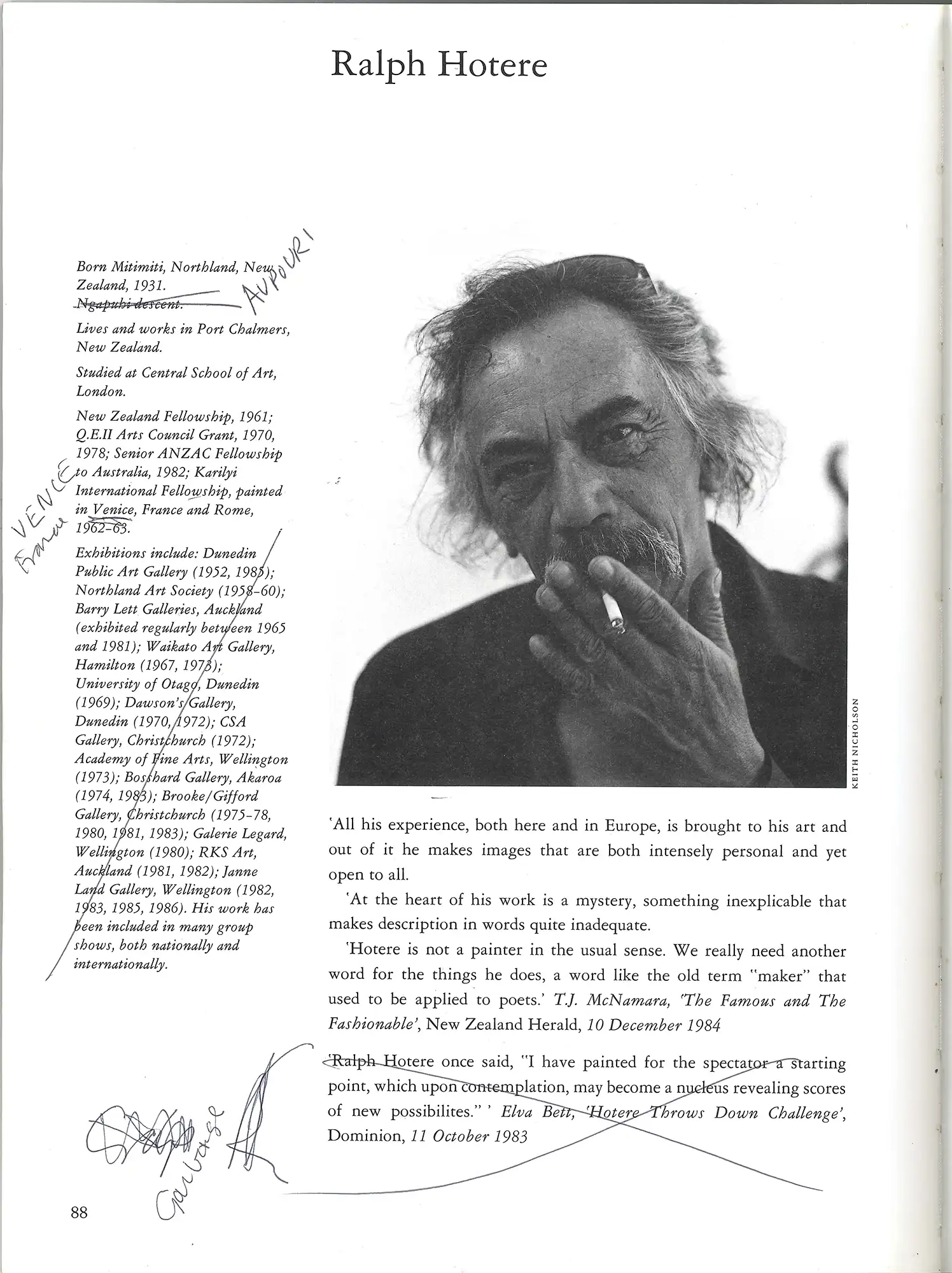 When writing entries about people in any sort of publication – biographies, articles, art catalogues and so on – it is the responsibility of the writer to be as accurate as possible, to get the information right. A proof copy sent back to the subject is a sure way of preventing any mistakes. Here Hotere has taken his pen to the details printed in this 1989 catalogue, taking issue with tribal affiliations given, the confusion over ‘Vence’ and ‘Venice’, and a statement (crossed out) which generates his response ‘Crap’ (crossed out) and then the final ‘Garbage’.