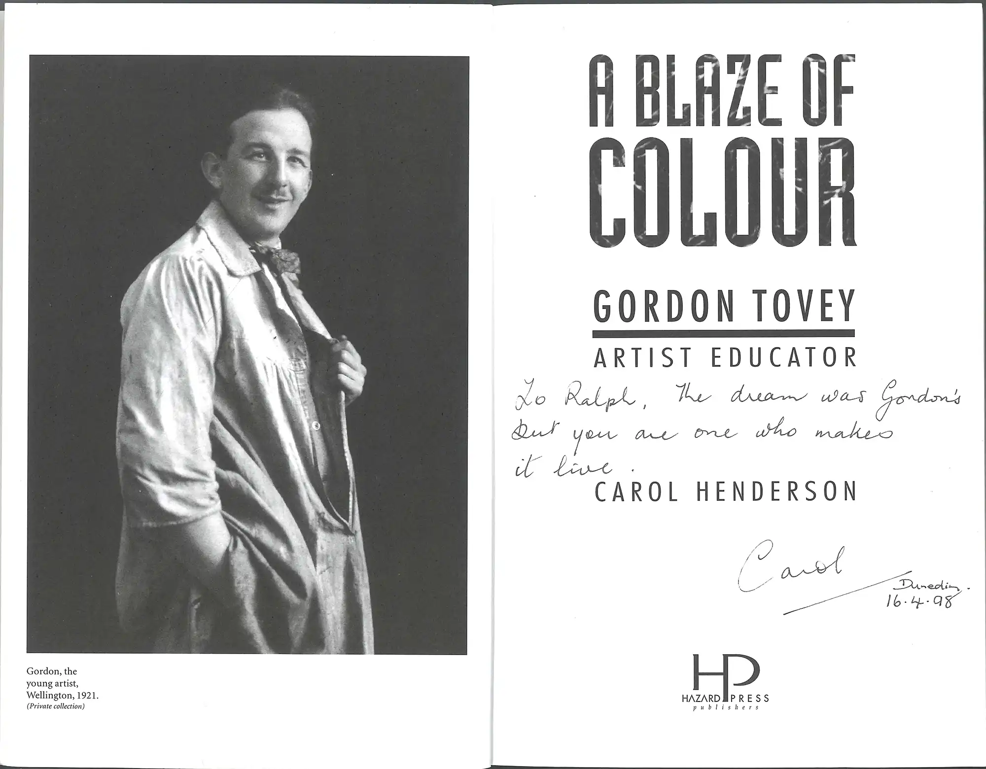 Carol Henderson, A blaze of colour. Gordon Tovey. Artist educator. Christchurch: Hazard Press, 1998. SPRH 709.2 COV (HEN)