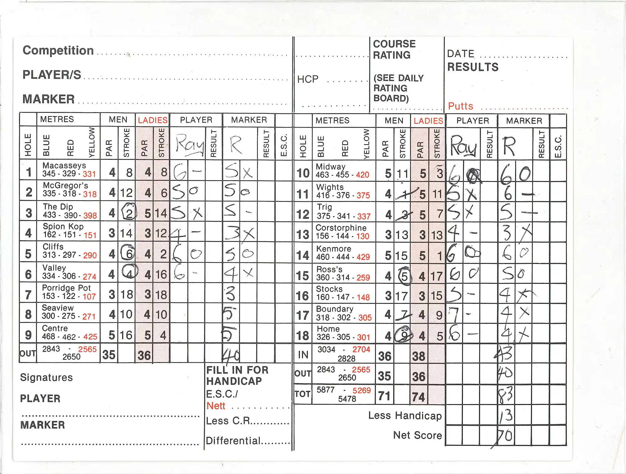 St. Clair Golf Club, Dunedin, NZ Mens and Ladies Card. Dunedin, c.1990s. Inserted in Dun Mihaka and Diane Prince, Whakapohane 1990. Wellington: Te Ringu Mangu Ltd, 1989.SPRH 345.0274 MIH