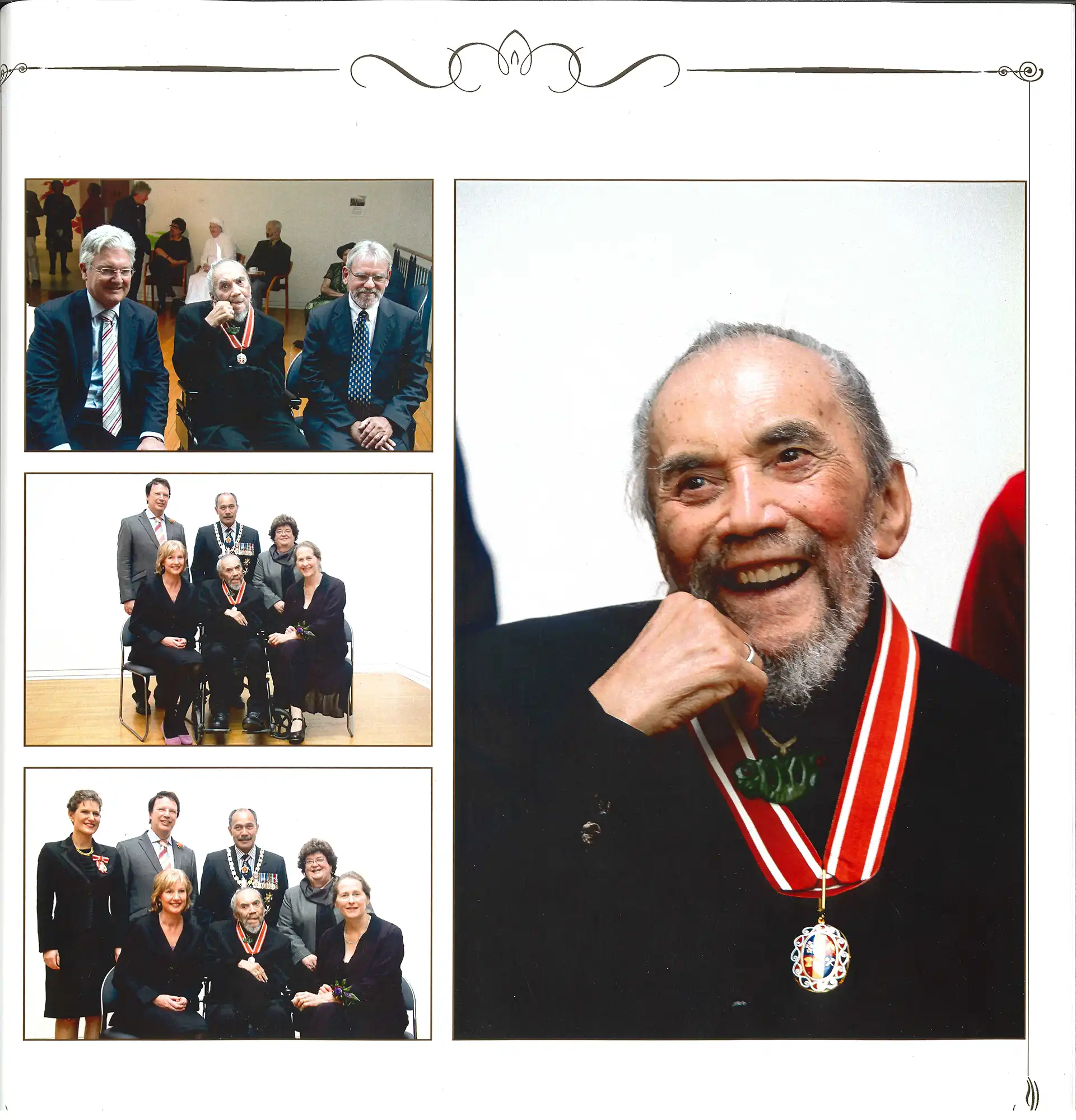 On Friday 30 March 2012, Lt. General the Right Honourable Sir Jerry Mateparae visited Dunedin to invest Ralph Hotere with the Order of New Zealand, the country’s highest honour. The Order, established in February 1987, is limited to 20 ordinary members living at any one time. The medal Hotere received on the day already had a strong whakapapa, with previous holders being the Rt Rev. Manuhuia Bennett, the Anglican Bishop of Aotearoa from 1968 to 1981, and Sir Paul Reeves, former Governor-General of New Zealand. Photographs were taken of the celebration at the Dunedin Public Art Gallery which form this ‘Investiture’ portfolio. On display is one spread depicting Hotere, close family and friends enjoying the event. According to sources, Hotere said that ‘I think this is the best day of my life’.