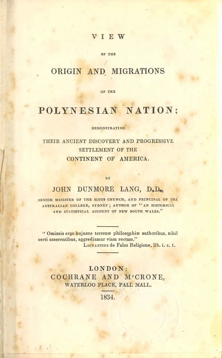 John Dunmore Lang. View of the Origin and Migrations of the Polynesian Nation. London: Cochrane and M’Crone, 1834.